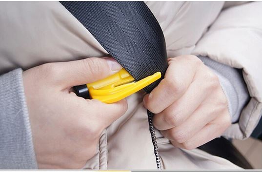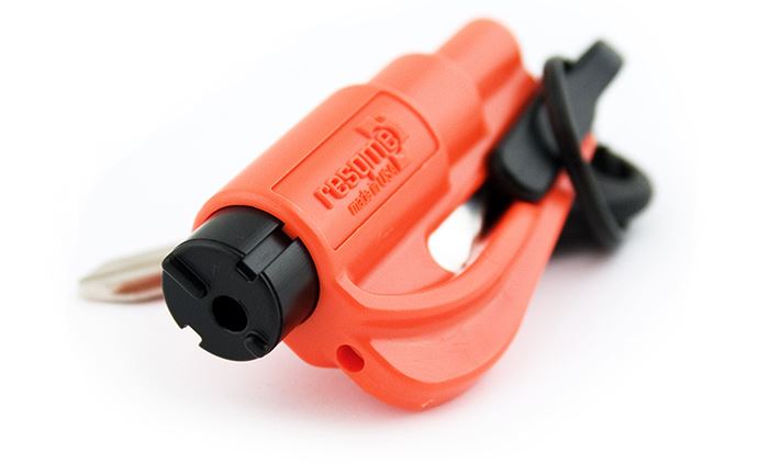 - besitzt auch ein Schneidewerkzeug, welches durch Entfernen des Clips, der am Schlüsselanhänger befestigt ist, gezogen wird. Damit können auch Gurte einfach zerschnitten werden.