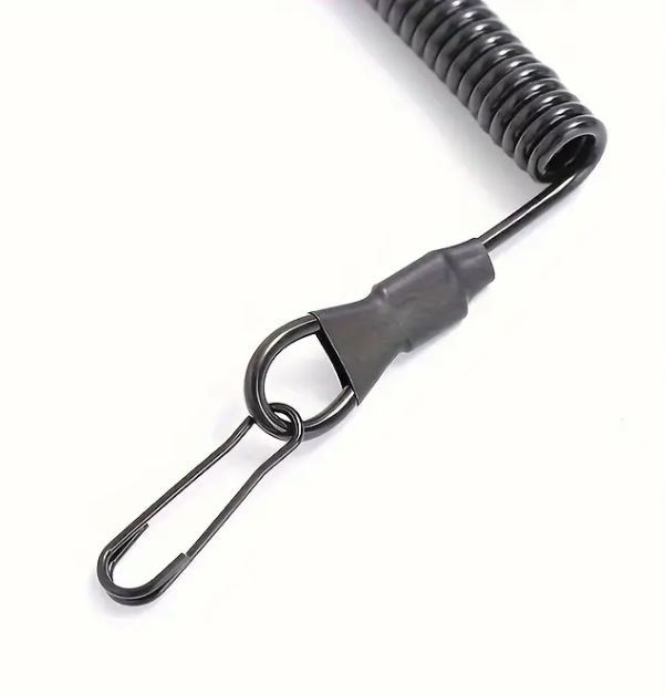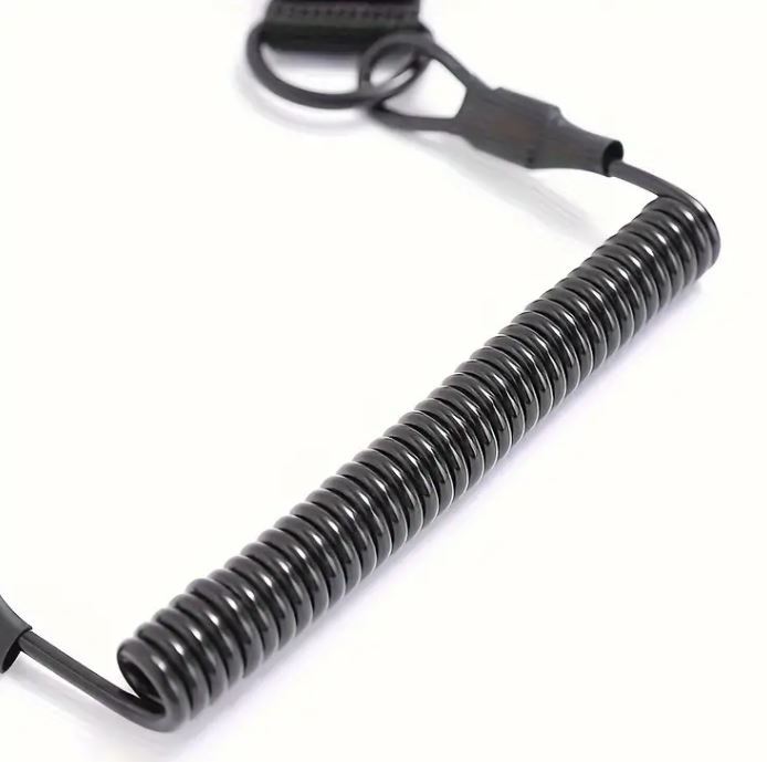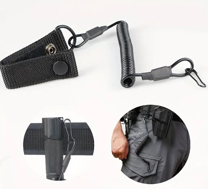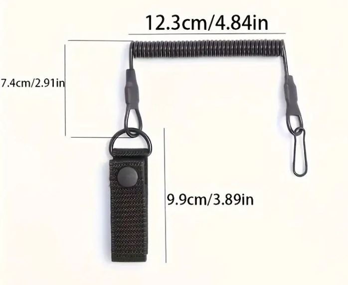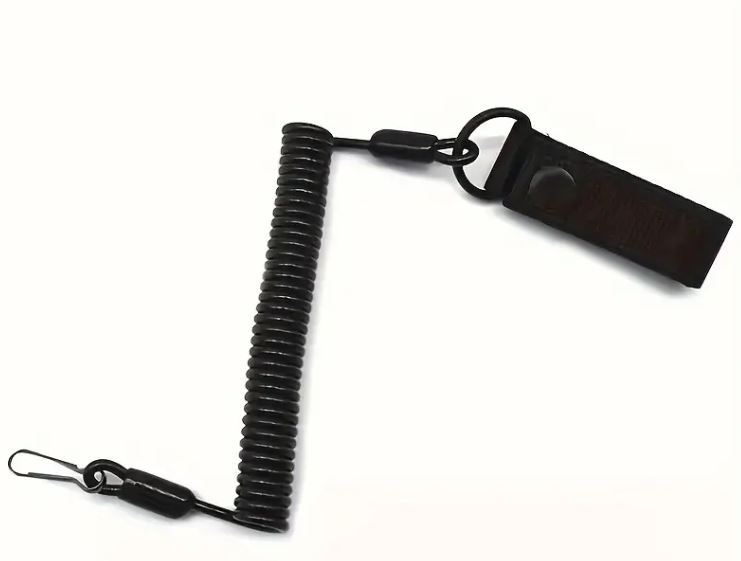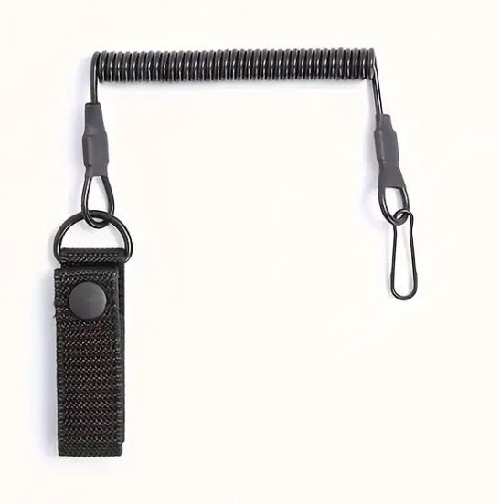 Ein Spiralsicherungsseil zur Sicherung von Schlüsseln, Pfefferspray, Lampe, Funk oder sonstigen Einsatzgegenständen. Hauptmaterial: Metallfaser,PA (Polyamid, Nylon). Es besteht aus einer Gürtelschlaufe und einem Schlüsselclip